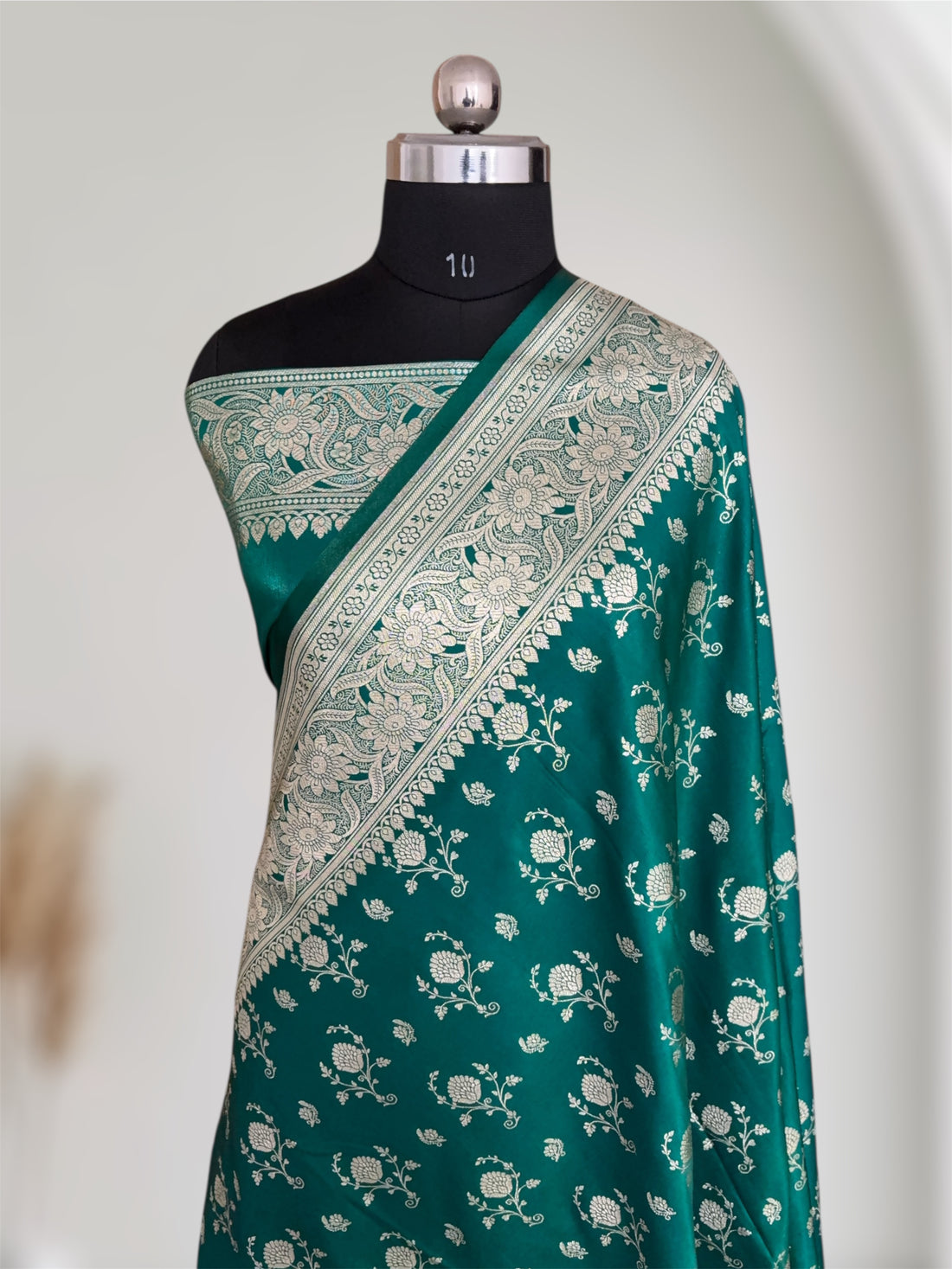 Rama Green Floral Buti Satin Silk Banarasi Saree