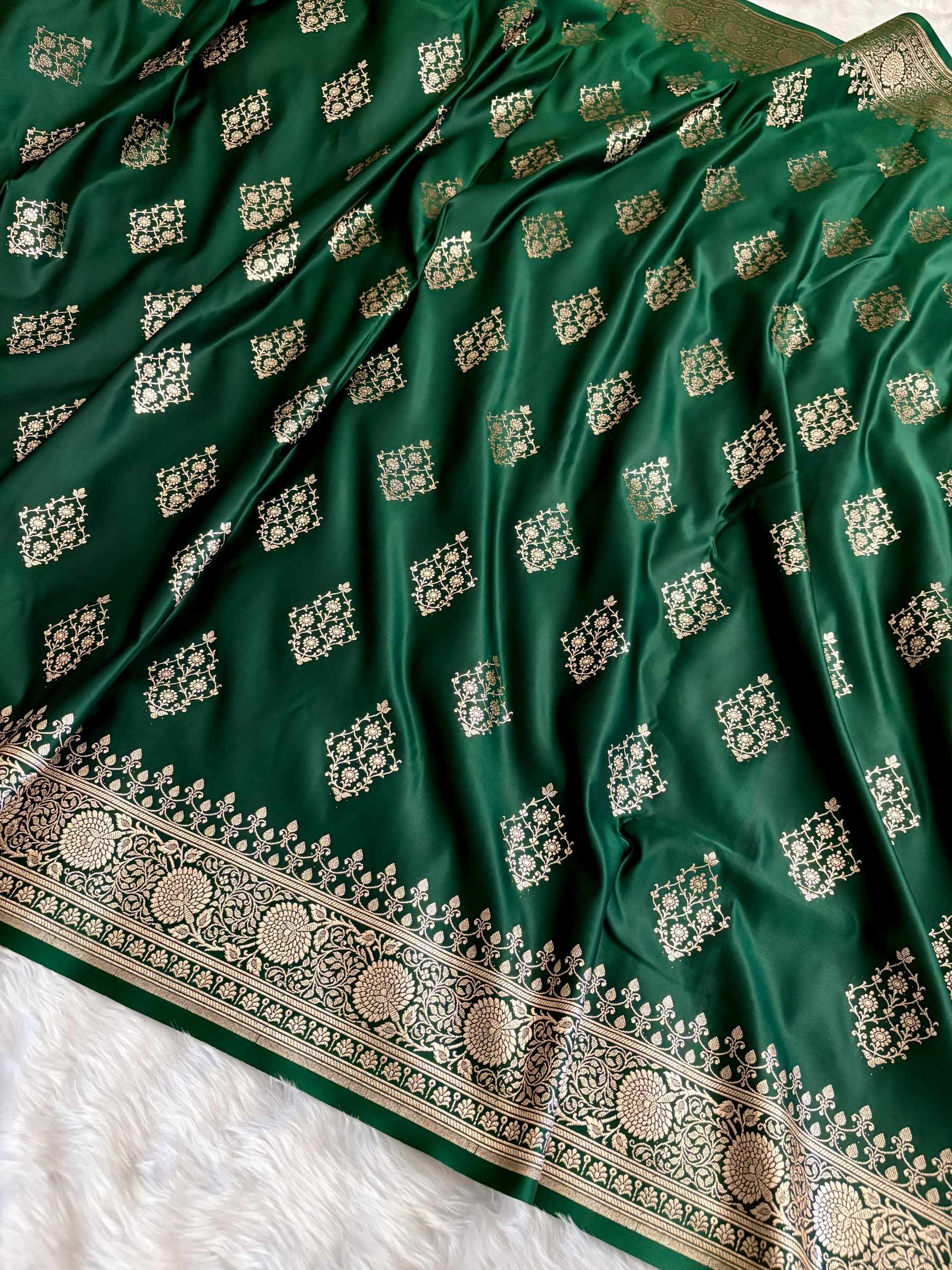 Bottle Green Kataan Silk Banarasi Saree – Light Golden Zari Work