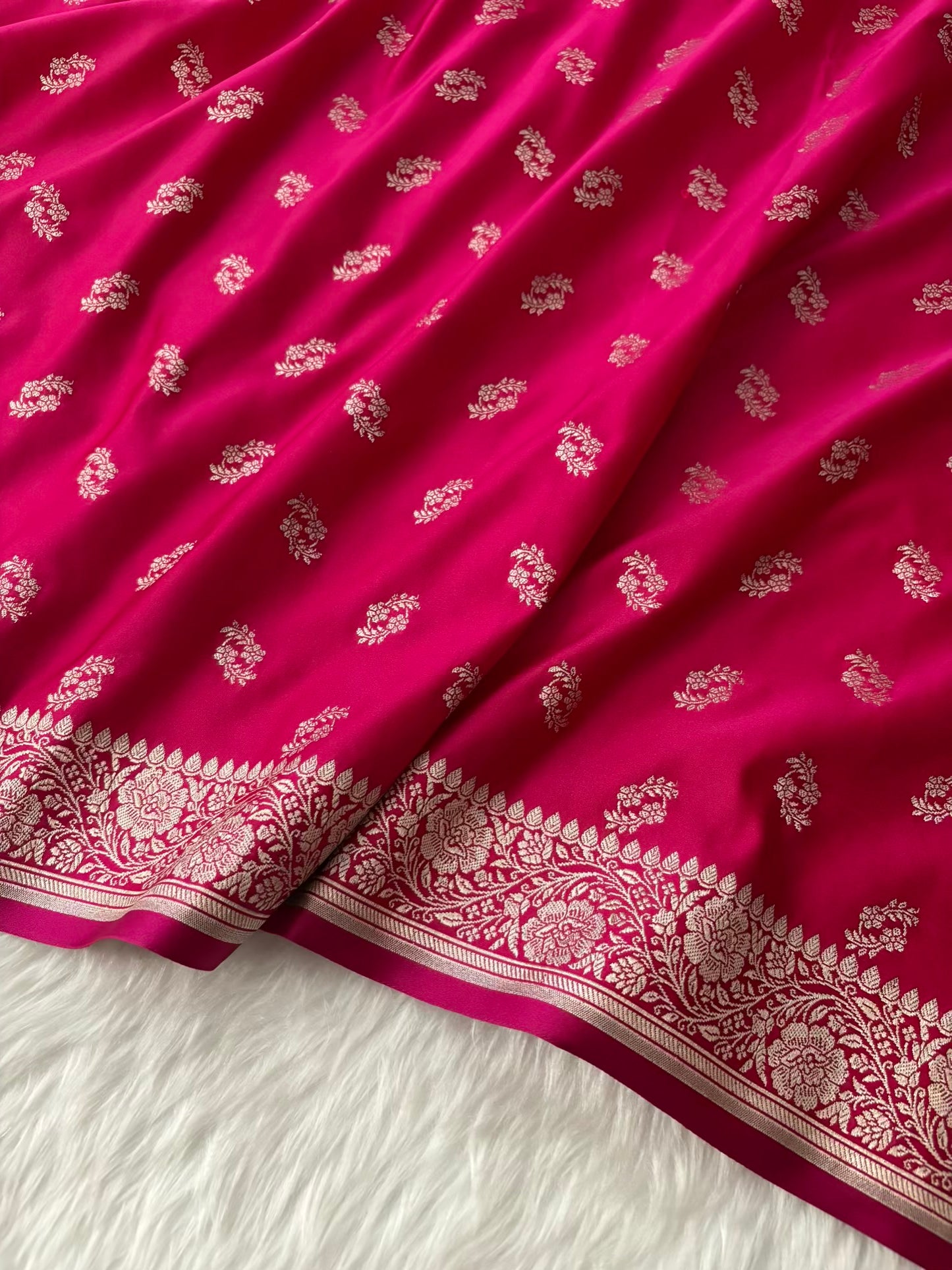 This Rani Pink Soft Katan Silk Banarasi Saree is woven with elegant silver zari star motifs scattered gracefully across the body. The soft katan silk gives a smooth, fluid drape while maintaining that rich Banarasi structure and finish.